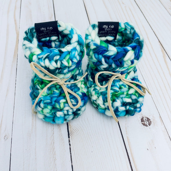 Made from ethically-sourced 100% Merino wool, super soft genuine chocolate suede leather soles & soft leather laces. These sweet little green, blue and white crocheted baby booties will keep your little one's toes toasty in the winter & comfortable in the summer! These make a wonderful baby shower gift & are often kept as heirloom pieces.