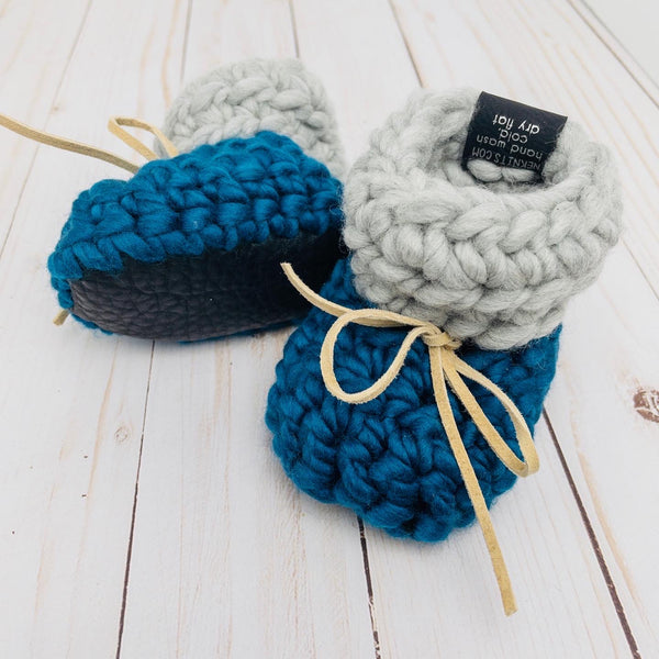Made from ethically-sourced 100% Merino wool, super soft genuine leather soles & soft leather laces, these sweet little crocheted baby booties will keep your little one's toes toasty & ready to go! These make a wonderful baby shower gift & are often kept as heirloom pieces.