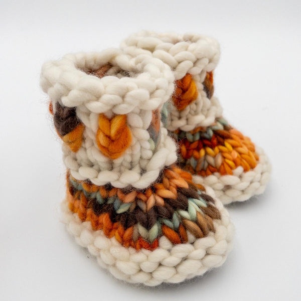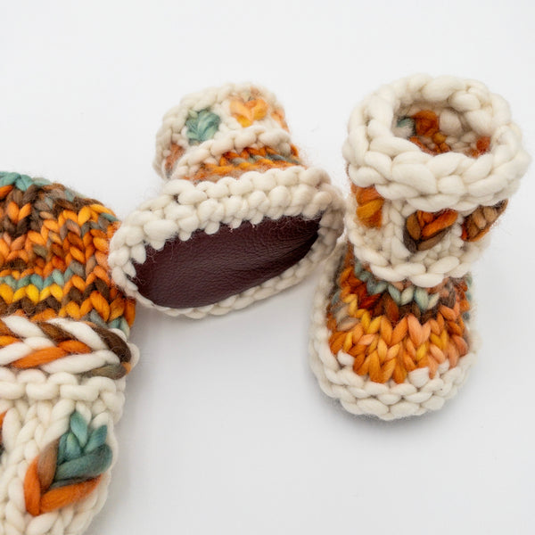 Please note that some variation in the colorways will occur due to the use of small-batch, hand-dyed yarn. Spot clean only for the booties. Hats can be gently handwashed in luke-warm water with mild detergent, gently squeeze out excess water, lay flat to dry.
