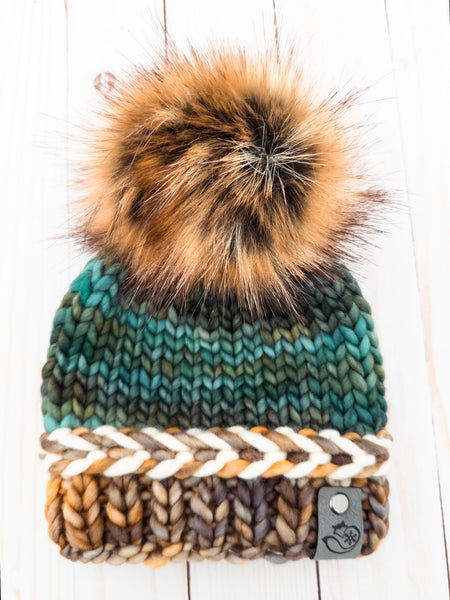 100% merino wool, incredibly soft & warm, Tidal Crest Latvian Braid Brim Beanie in Laguna Negra and Draco. colorways. The Adult size comfortably fits 21-23” circumference, topped with a lush, handmade Canadian Fox Quick Connect Pom Pom. Super easy to remove the Pom Pom with no extra tools needed, just pinch the toggle and pull off the Pom!