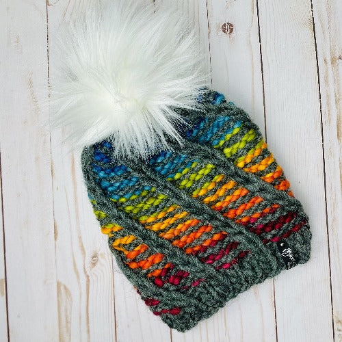 Absolutely stunning rainbow of colors with a charcoal swirl around this beanie is a sight to behold while keeping you cozy, toasty warm!!
